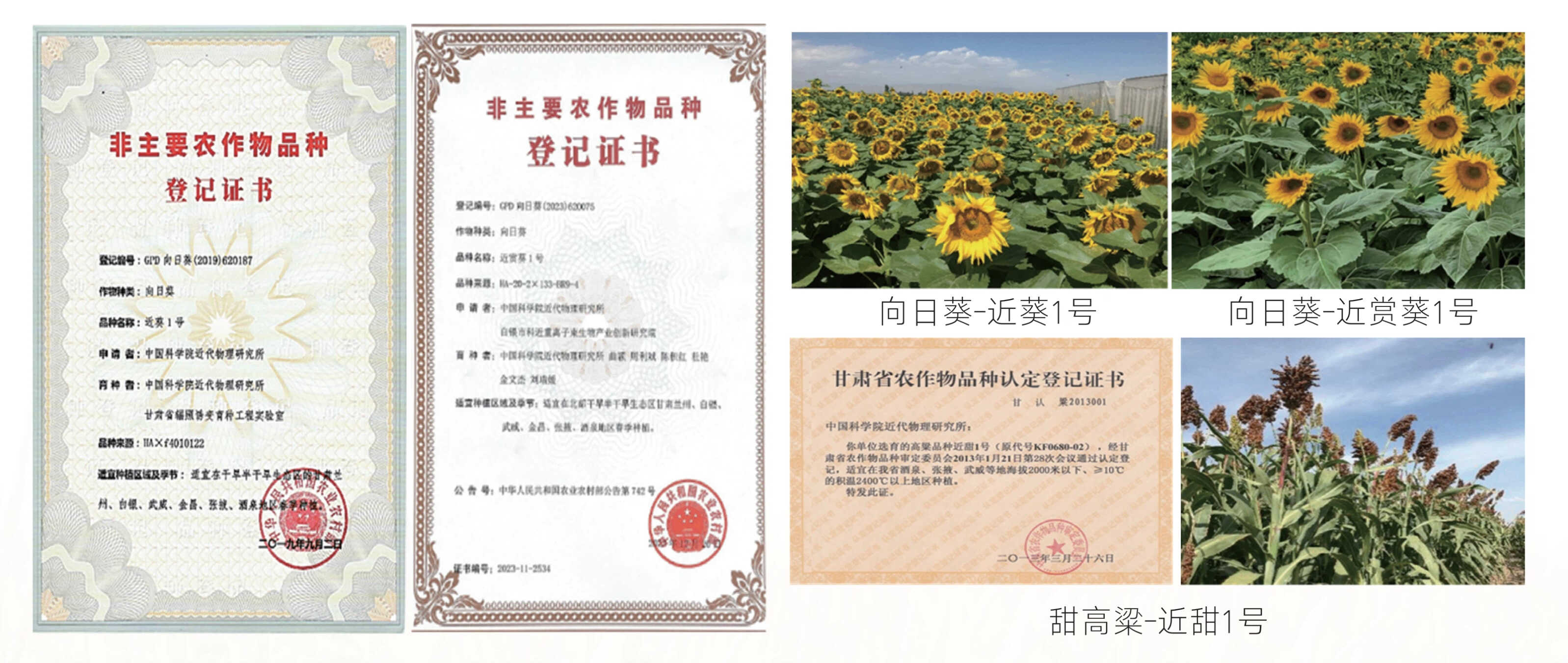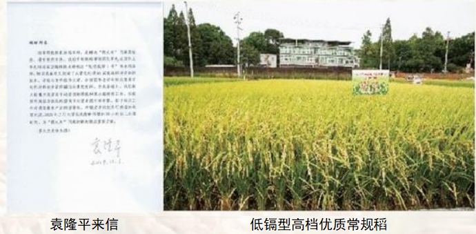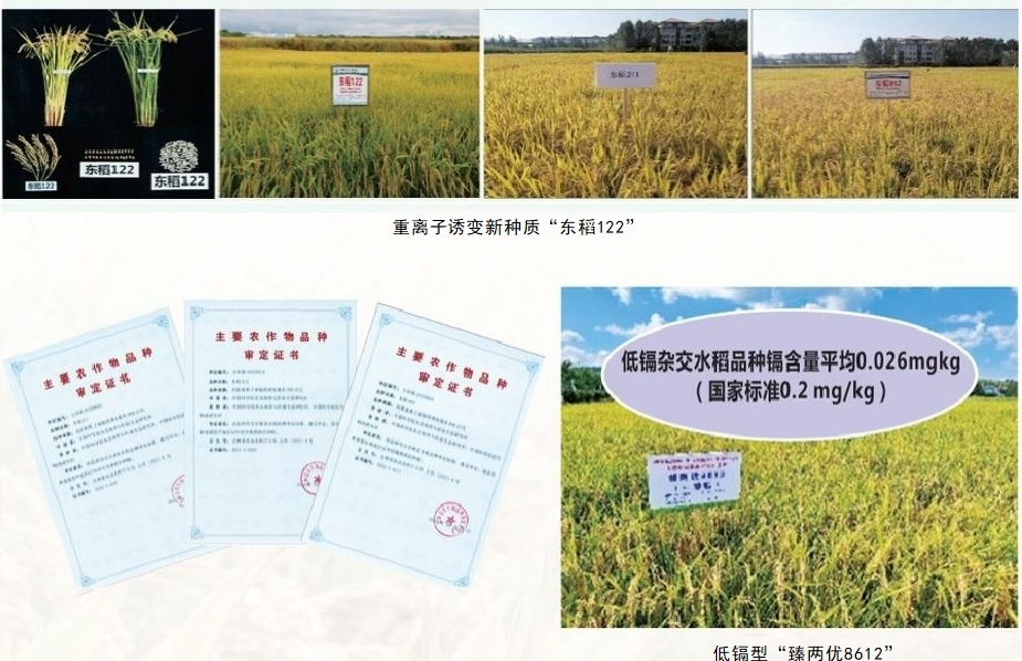 近代物理研究所与袁隆平团队联合开 展重离子诱变水稻工作,与袁隆平团队合 作培育出镉低积累高档优质常规稻“韶香 100”和国内外首个大面积应用的杂交稻低 镉型“臻两优8612”,2023年在湖南推广超150万亩,填补了适于我国绝大部分中、重度镉污染稻田种植的水稻品种空白。