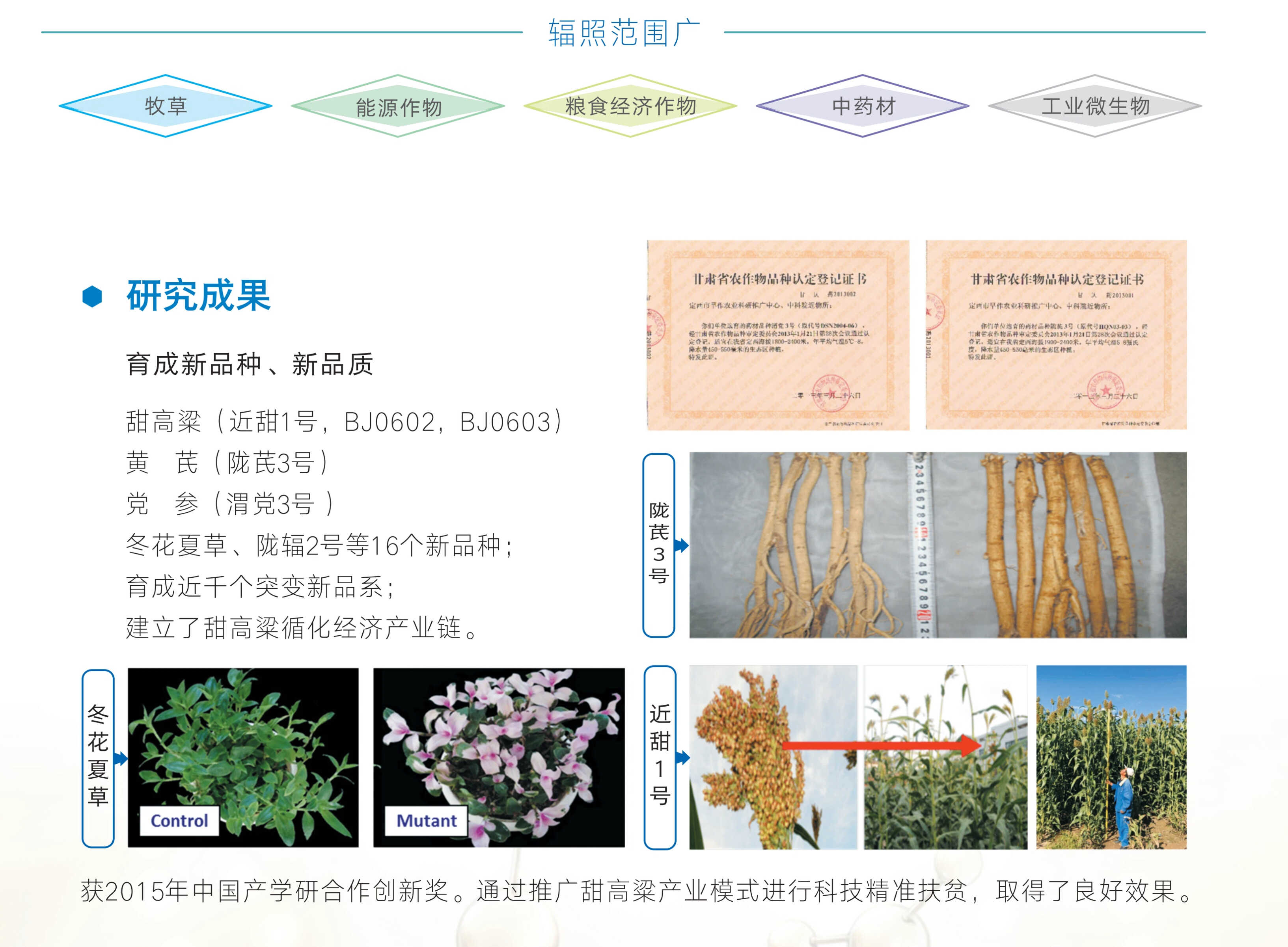依托兰州重离子加速器装置 (Heavy lon Research Facility in Lanzhou,HIRFL)——亚洲能量最 高、离子种类最多的大型回旋加速器,生物物理室整合集实时束流监测、自动化高效换样系统于一体的 TR4 终端,建成了国内外一流的重离子束辐照诱变育种平台,连续多年高效规模化实践生物育种。为推动 科研成果转化,2019年成立白银市科近重离子束生物产业创新研究院,聚焦诱变育种、生物产品研发和推 广,以及企业孵化,搭建“科研平台-技术实践-产业落地”的完整链条。