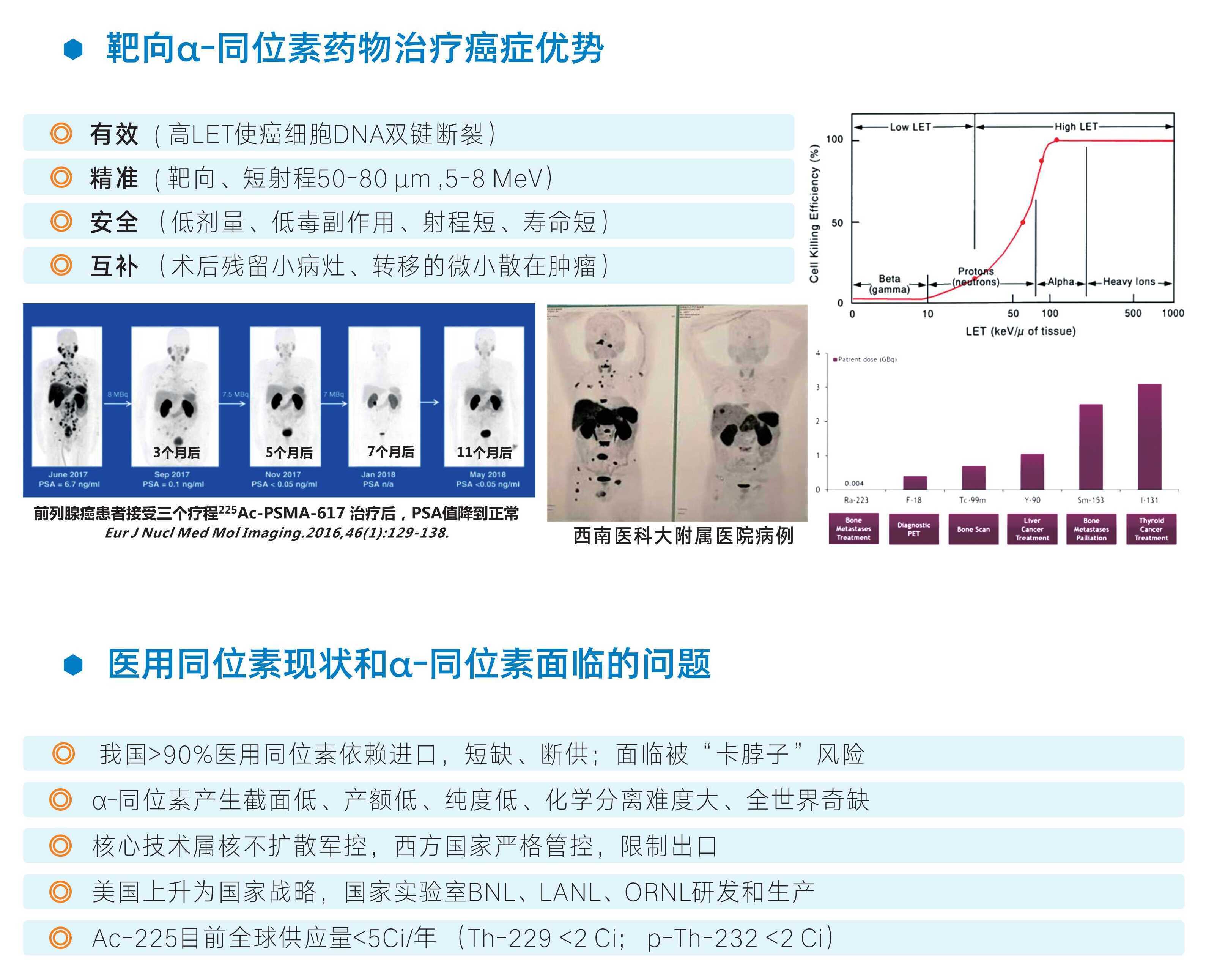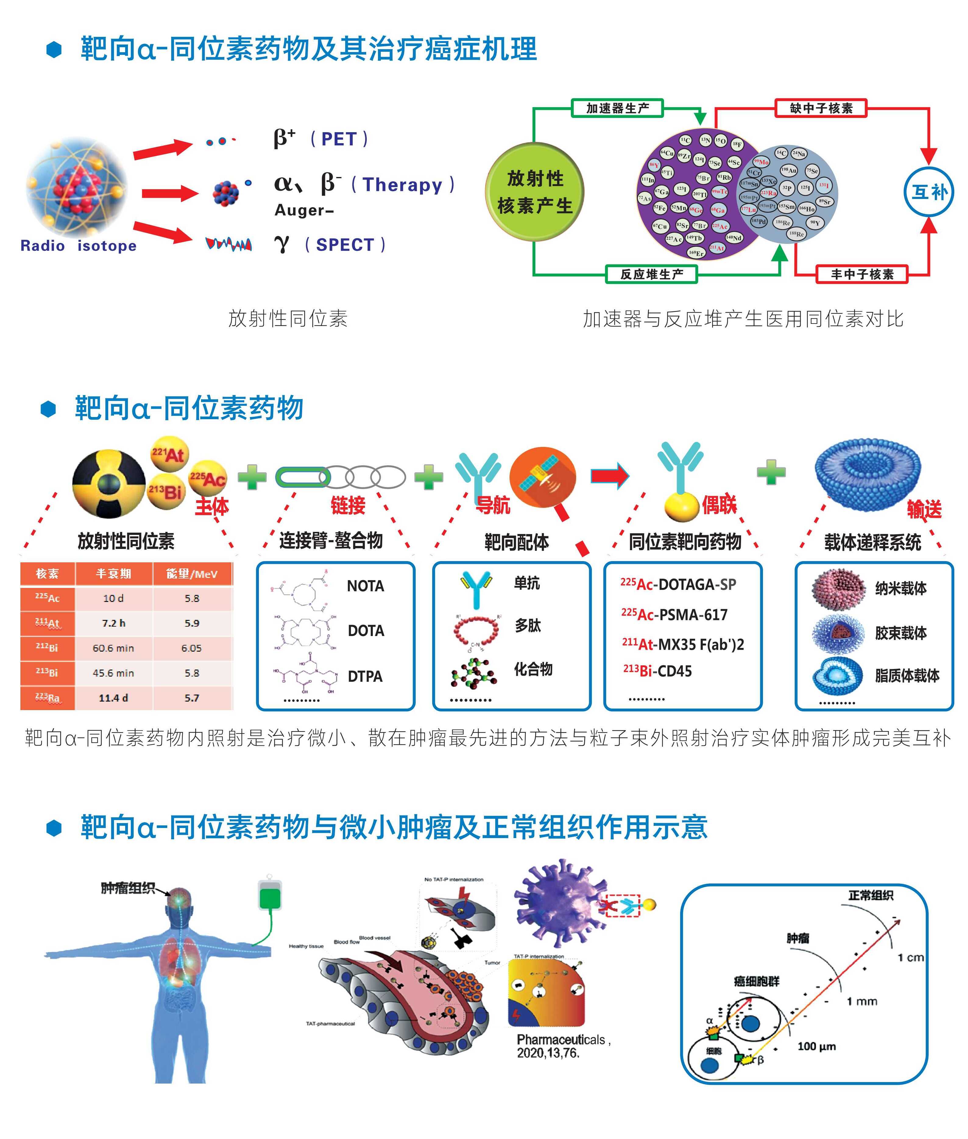 阿尔法(α)放射性同位素靶向药物治疗(TAT)癌症具有精准、有效、安全等特点,最具产业化发展和大规模临床应用前景,与粒子束外照射实体肿瘤形成互补,是目前医用同位素发展的科技制高点,也是国际放射治疗的热点和新发展趋势。