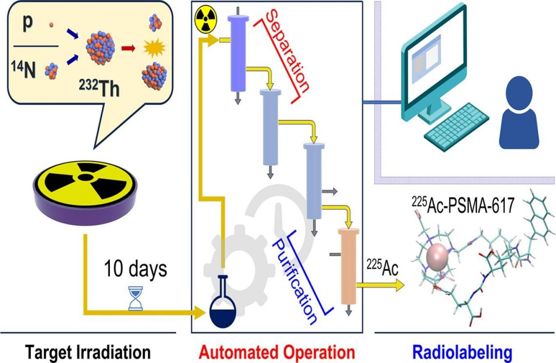 辐照、分离及标记生产锕-225靶向药物的路径示意图