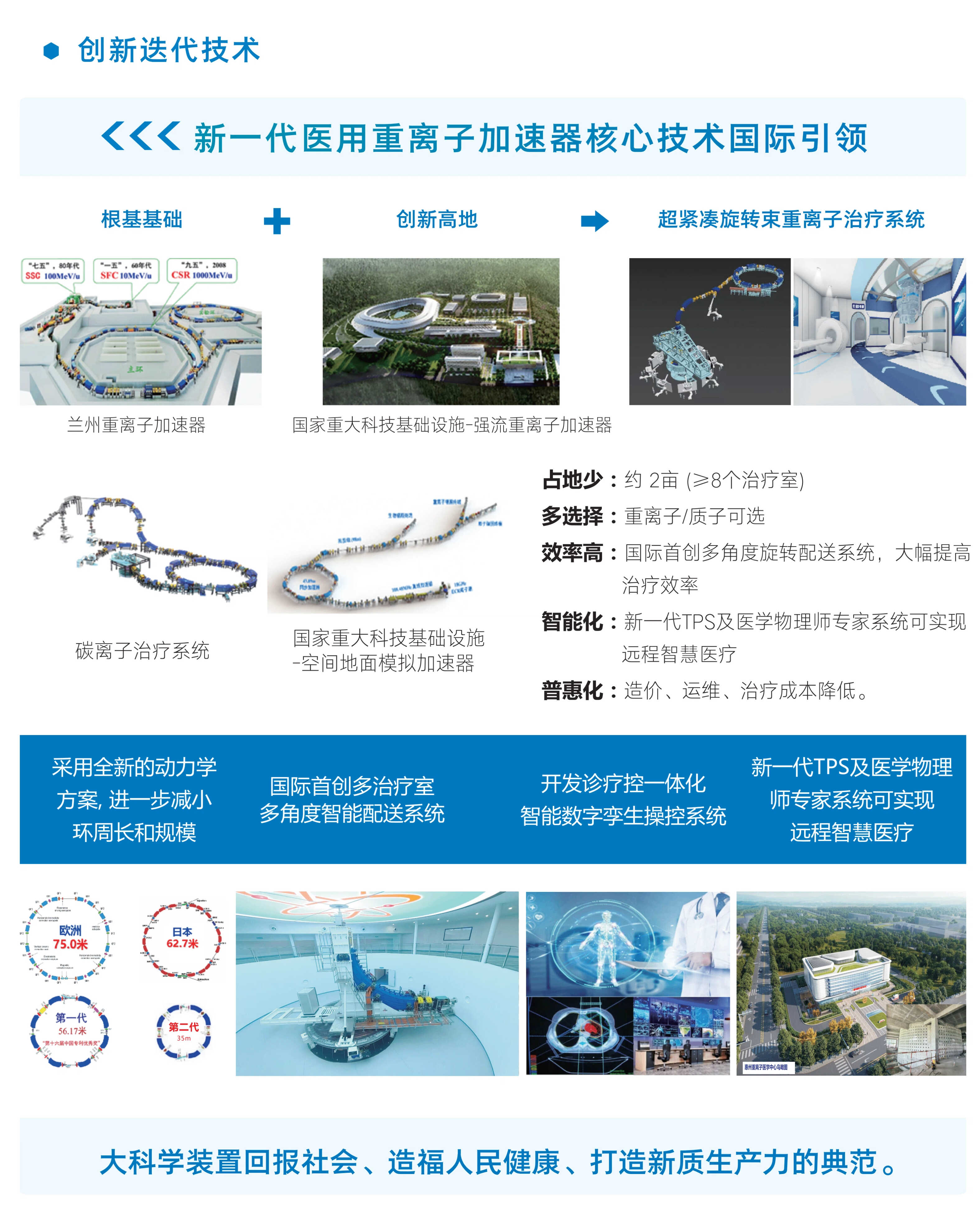 新一代医用重离子加速器装置于2024年5月落户广东惠州,大幅度减小设备占用空间和装置应用成本,可显著提高技术性能和治疗效率。国产医用重离子加速器的研发及临床应用,探索实践了“基础研究一技术研发产品示范一产业化推广”的全链条自主创新之路,对提高我国人民健康水平、建设“健康中国”具有重大意义。