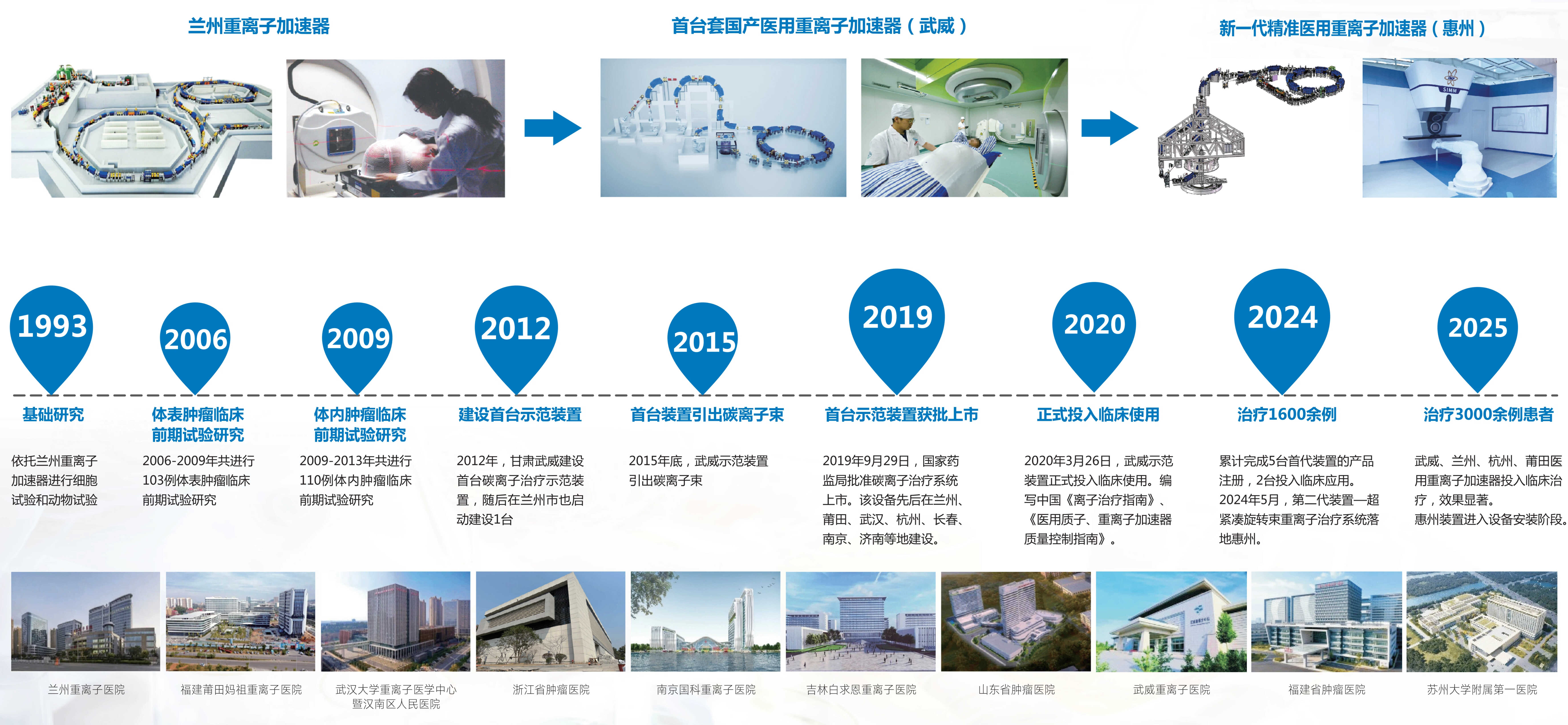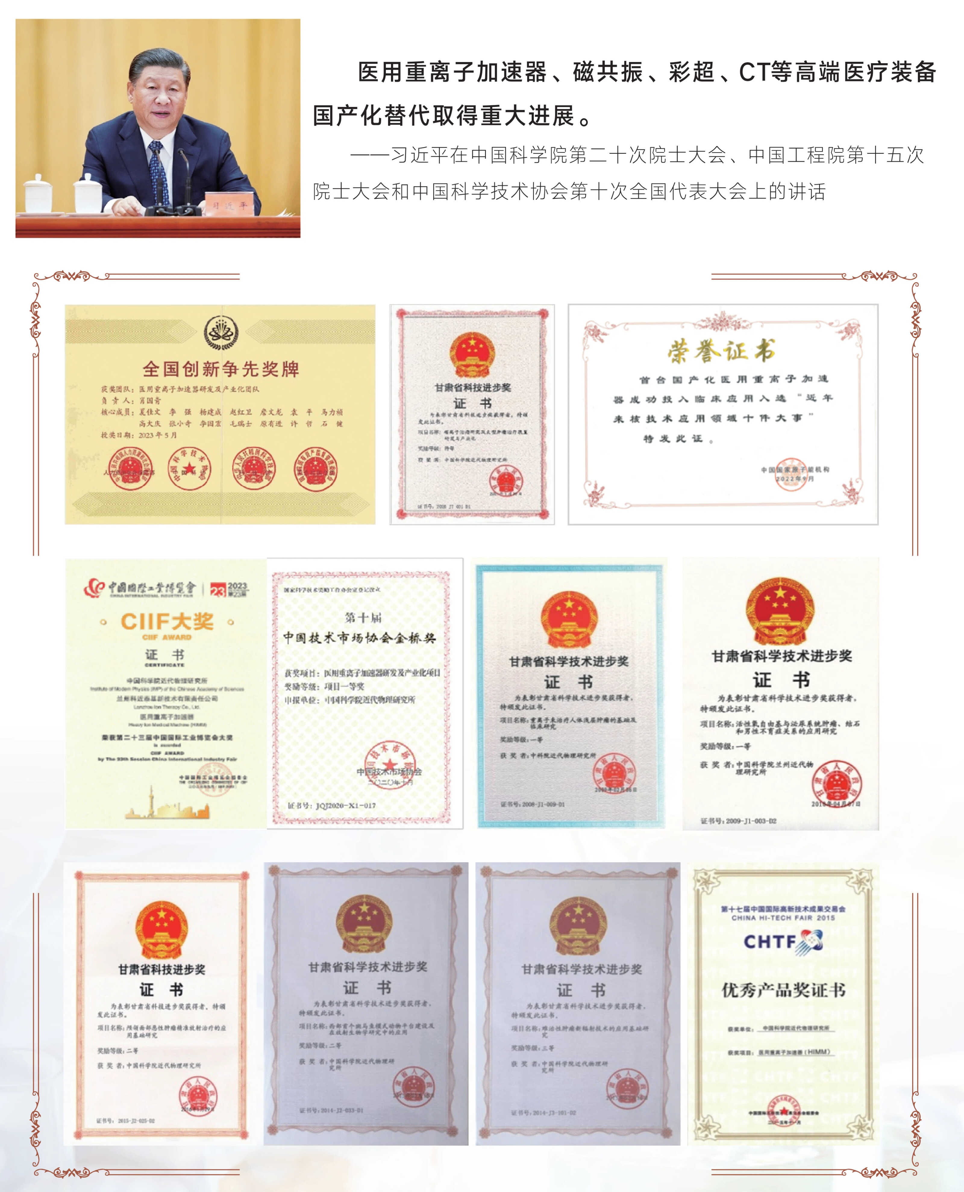 中国科学院近代物理研究所三十年磨一剑,成功研制了我国首台具有完全自主知识产权的医用重离子加速器并投入临床应用,实现了我国大型高端放疗装备零的突哦。首台国产医用重离子加速器于2020年3月投入临床应用,疗效显著,累计推广建造10台,4台已投入临床应用,疗效显著,产生了巨大的经济和社会效益。