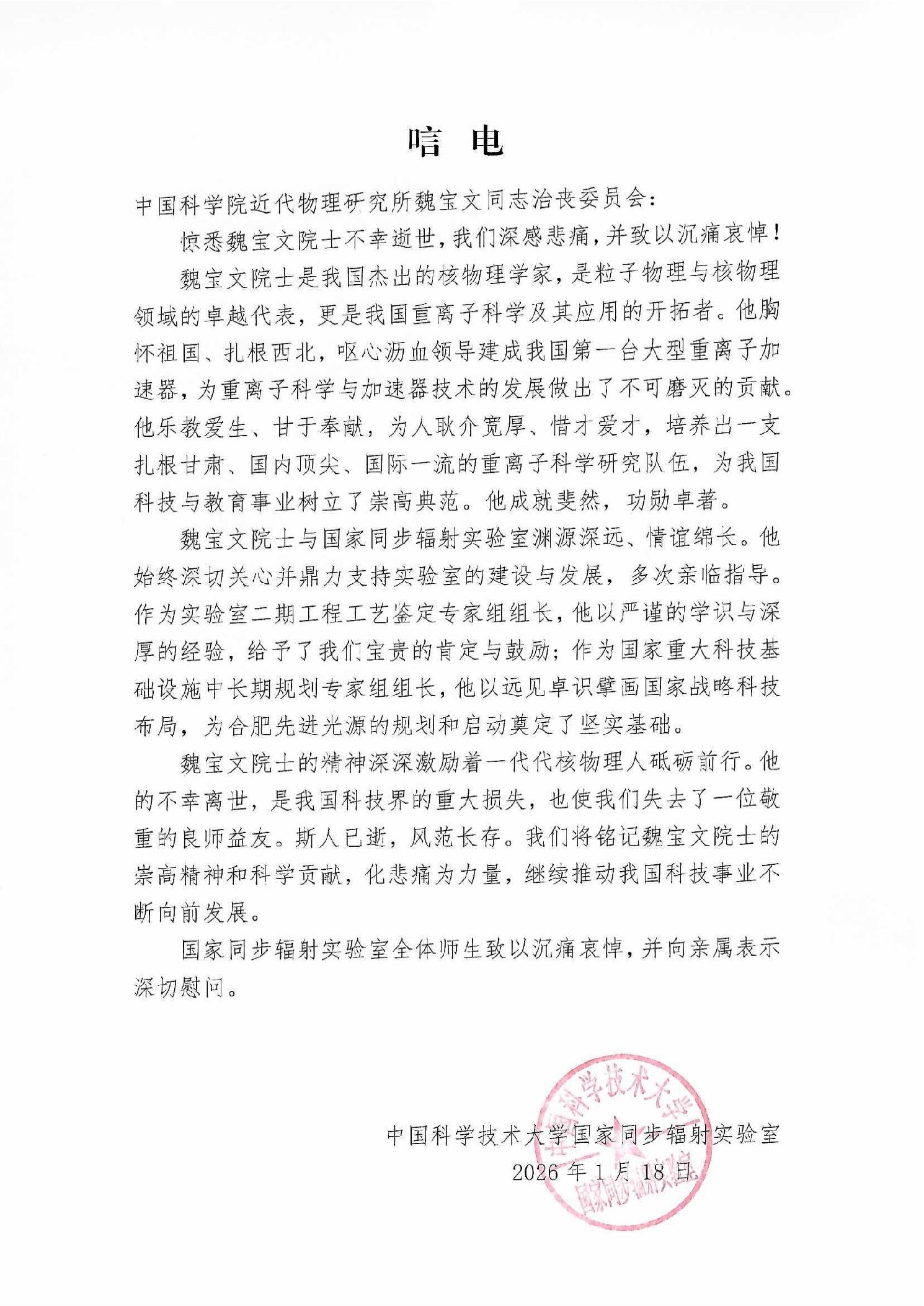 唁电--中国科学技术大学国家同步辐射实验室
