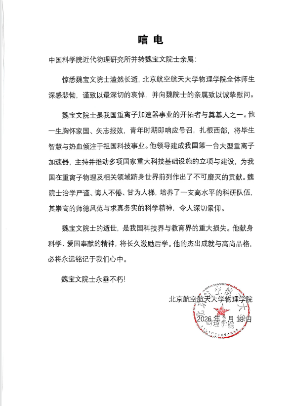 唁电----北京航空航天大学物理学院