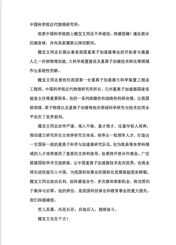 唁电----复旦大学现代物理研究所、复旦大学核物理与离子束应用教育部重点实验室