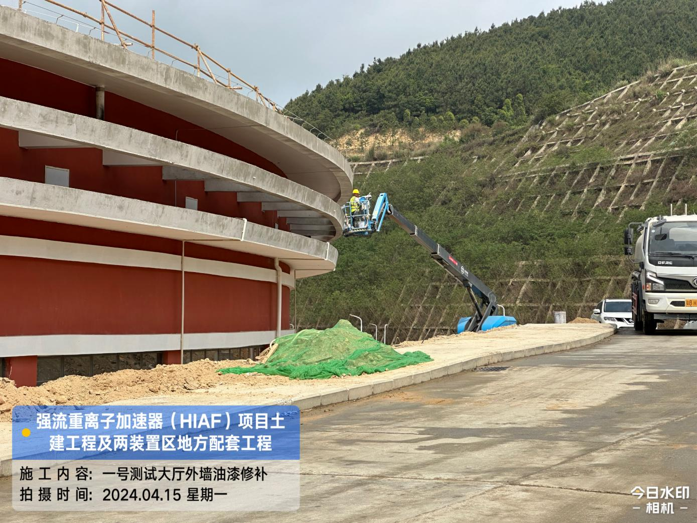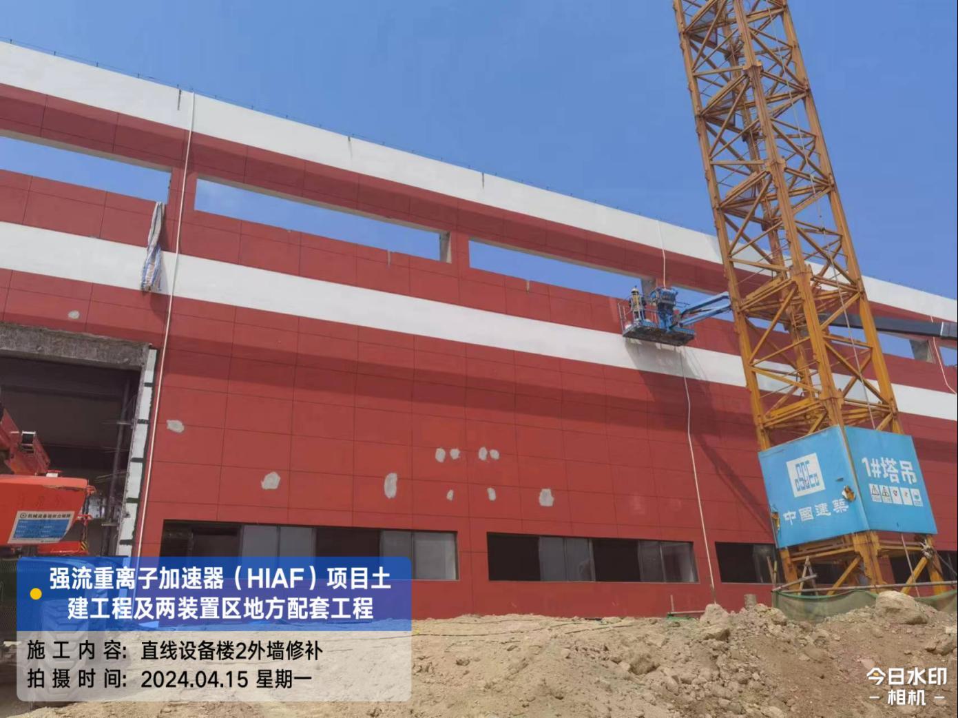 二、HIAF区其它单体:一号测试大厅PC1-9段卫生间贴砖完成,门安装完成。二号测试大厅管井抹灰腻子完成,电梯洞口封堵抹灰完成,电梯门洞装饰板完成30%。一号综合站房(1#)内墙抹灰腻子完成90%,外墙抹灰完成100%,外墙油漆完成45%,门窗框安装完成80%;(2#/3#)外墙油漆修补完成80%。直线设备楼(1#)门窗安装完成85%,外墙涂料完成90%,屋面保护层完成60%;(2#)屋面保护层完成100%,门窗框安装完成90%。室外直线设备楼(1#)室外人行道浇筑完成70%;直线设备楼(2#)室外东侧人行道浇筑完成60%;道路H线KO+140~220段道路浇筑完成50%。