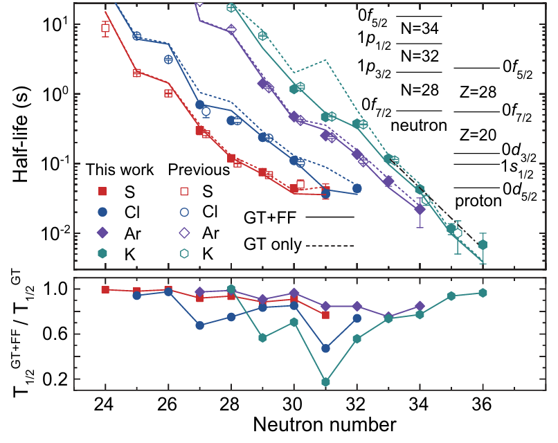 图2:上图:丰中子S、Cl、Ar和K同位素的β衰变半衰期系统性。实心符号表示本次实验的测量值,空心符号为文献值。实线和虚线分别展示了同时包含GT和FF跃迁以及仅考虑GT跃迁的壳模型理论半衰期。黑色点划线用以突出54K35半衰期的偏离系统性下降。相关的中子、质子轨道显示在了右上角。下图:包含FF和GT跃迁的理论半衰期与仅考虑GT跃迁的理论半衰期之比