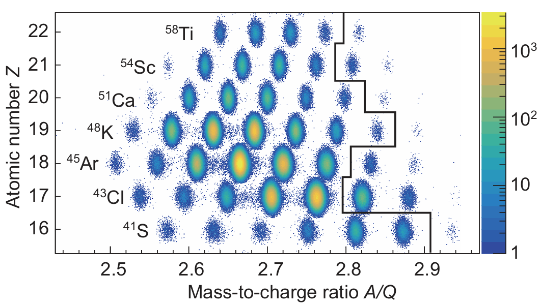 图1:本次实验的原子核二维粒子鉴别图。图中黑色实线右侧为本工作首次测量半衰期的原子核