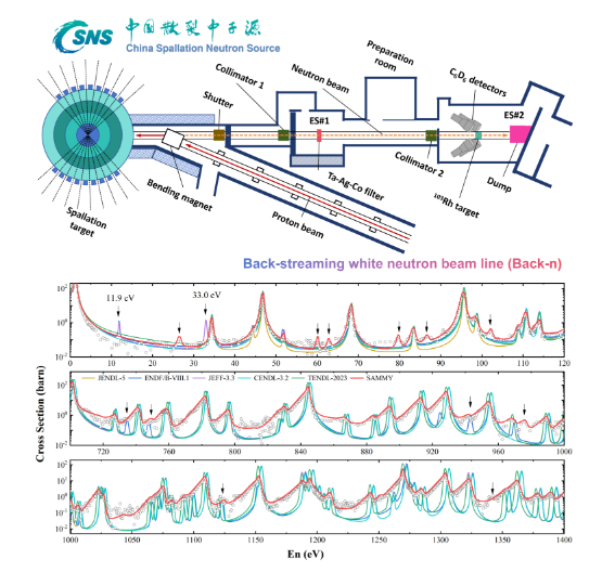 在中子俘获反应研究方面,研究团队基于中国散裂中子源反角白光中子束线(CSNS Back-n),利用高纯度铑-103靶材开展了1eV-1MeV能区中子俘获反应截面的直接测量。实验结果表明,国际主要评价数据库ENDF/B-VIII.1,JEFF-3.3和JENDL-5中11.9 eV和33.0 eV处标注的共振能级并不存在。分析认为,上述数据库中的共振峰可能源于早期实验样品中铂族元素钯(108Pd)与铂(195Pt)杂质的贡献。此外,基于CSNS Back-n束流的高注量率和优异的飞行时间分辨能力,本次实验首次发现了铑-103的8个新共振峰,并利用R-矩阵程序SAMMY提取了相应的共振参数。