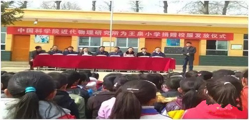 在深入走访的过程中,近代物理所帮扶小组发现王泉村村委会办公设施简陋,办公条件艰苦,王泉村小学学生也没有统一的校服。随即为王泉村村委会配备电脑两台、打印机2台、办公桌4张,办公椅40把。积极筹措资金39000元,为王泉小学学生捐赠校服300套。