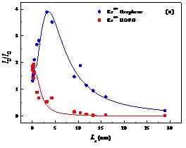 材料研究中心借助兰州重离子加速器(HIRFL)提供的能量479MeV的86Kr和250MeV的112Sn快重离子,以及320kV高电荷态离子综合研究平台提供的4MeV86Kr19+离子,对单层石墨烯样品以及高定向石墨(HOPG)进行了辐照。数据分析表明,相同辐照条件下,单层石墨烯与HOPG的辐照损伤具有明显差异,因此石墨烯的应用需要考虑离子辐照损伤的影响。通过改进Lucchese的理论模型,成功拟合了石墨烯与HOPG的实验数据(见图)。结果表明,石墨烯与HOPG的损伤程度(ID/IG)随入射离子注量的变化趋势不同,HOPG中只有激活区,而石墨烯辐照后除了激活区,还存在结构完全损伤区,两个区域的竞争导致石墨烯辐照损伤随注量有三个变化阶段,中间存在拐点。