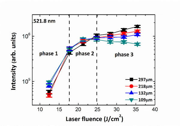 近期,近代物理所科研人员和合作者利用自主搭建的颗粒LIBS实验装置,以铜微颗材料为例,开展了微颗粒材料的LIBS信号随粒径和激光通量的变化趋势研究。