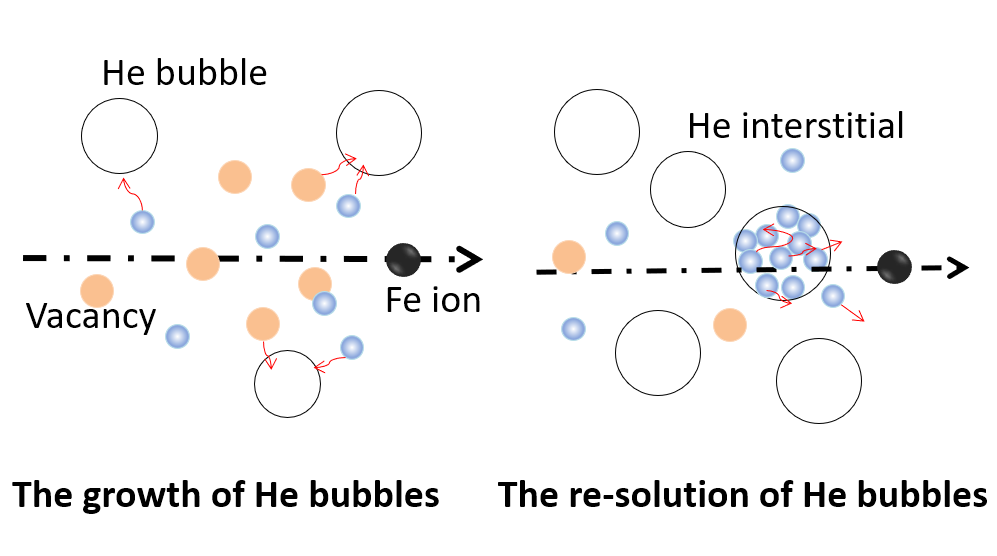 在逆序(Fe+He)辐照实验中,两者在材料中产生的辐照效应相对比较独立,两者相互影响弱。而在顺序(He+Fe)辐照实验中,预注入的氦离子对后续铁离子辐照引起的相变有明显的抑制作用。研究发现,当先期注入的氦离子在材料中形成氦气泡后,随后的铁离子辐照则驱动了氦气泡的进一步演化,它既可以促进氦气泡的生长,也可以使氦气泡重新溶解到材料基体中(这可以提高材料的抗氦气泡损伤能力)。