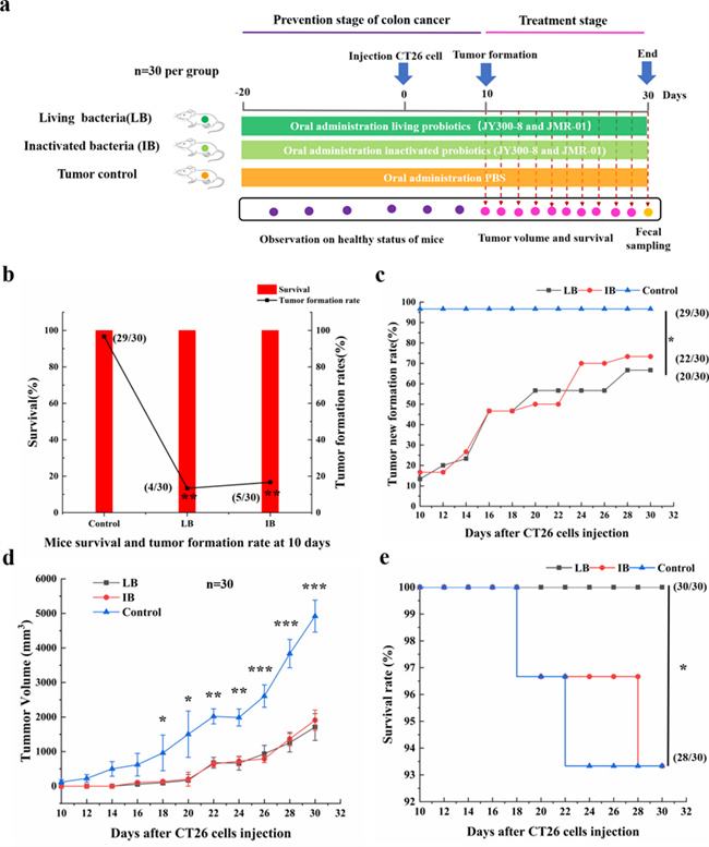 研究人员发现,二联益生菌可降低小鼠成瘤率和肿瘤体积,可显著抑制结肠癌易感模型小鼠肿瘤的发生和发展;益生菌可直接激活肿瘤细胞凋亡途径、调节肠道菌群增强抗肿瘤响应,抑制小鼠结肠癌的进程。研究人员首次将碳离子放射治疗手段和肠道微生物疗法的调理作用相结合,使结肠癌模型小鼠存活率较对照组提高了50%。