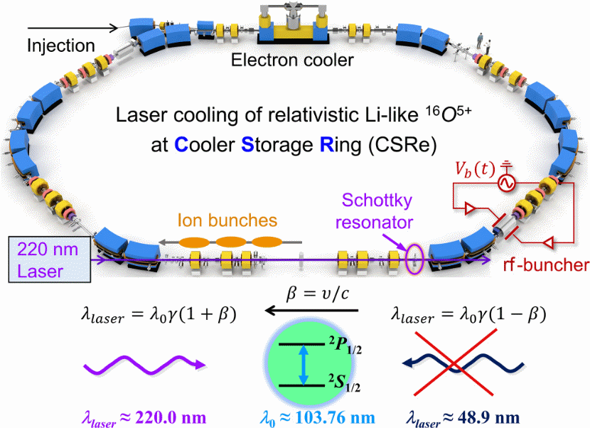 中国科学院近代物理研究所原子物理中心的科研人员在兰州重离子冷却储存环(CSRe)上首次开展了相对论能量类锂16O5+离子束的激光冷却和精密光谱测量实验。该实验是目前激光冷却实验中离子束能量最高、离子电荷态最高、跃迁波长最短的实验,激光冷却相关研究成果以Letter形式发表在Phys. Rev. A上,精密激光谱学实验成果发表在Nucl. Instr. Meth. A上。