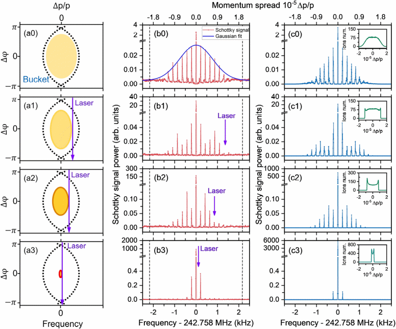 图3. 精密激光谱学实验结果:电子冷却下16O5+离子束与220 纳米激光作用后的肖特基频谱。