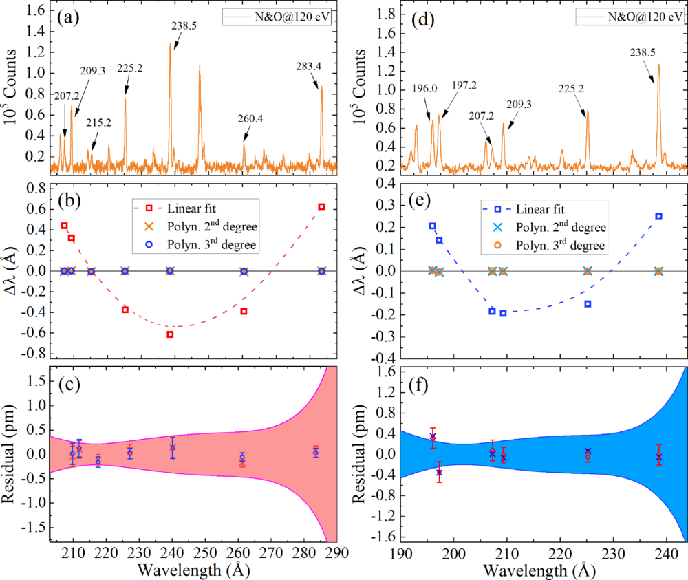 图2. (a, d)分别为类铍 S12+和Cl13+离子的校刻光谱;(b, d)分别为S12+和Cl13+离子的离子色散函数的残差图;(c, f) 为残差放大图和1-σ置信区间;