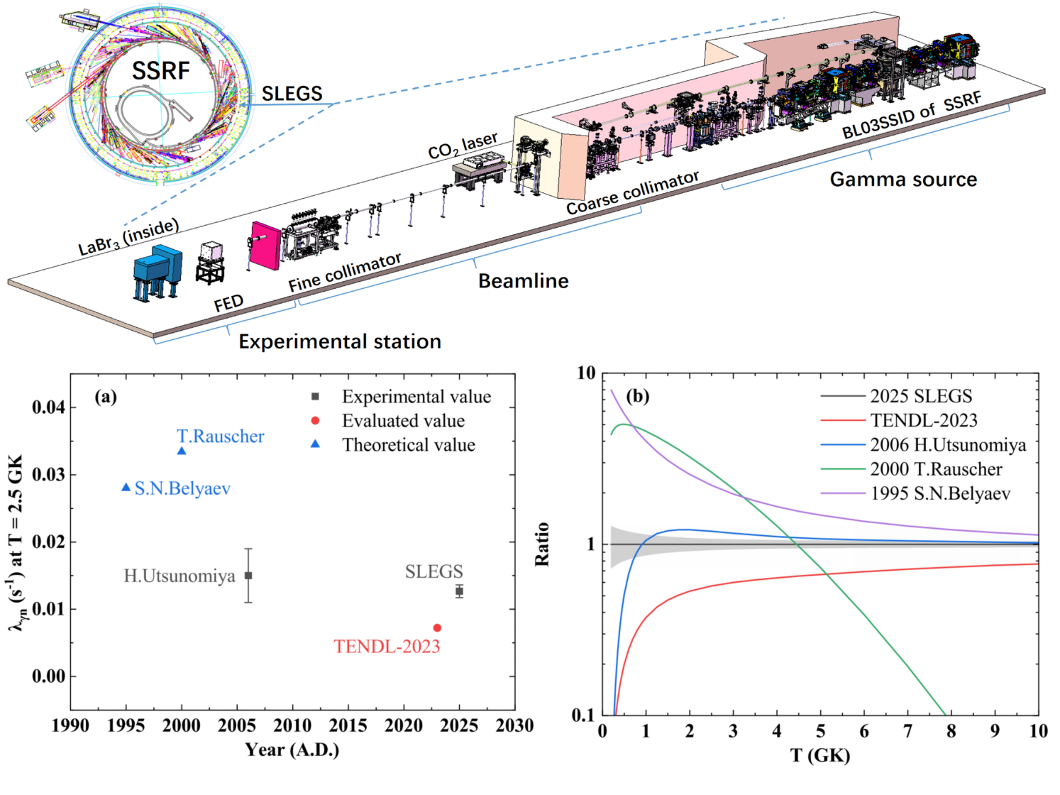 图:SLEGS线站光核反应实验布局以及141Pr(γ,n)反应率的综合比较